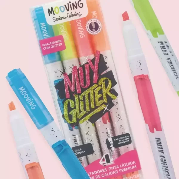Este set de 4 resaltadores te permitirá destacar tus textos y notas de manera brillante y atractiva, gracias a su efecto Glitter.
